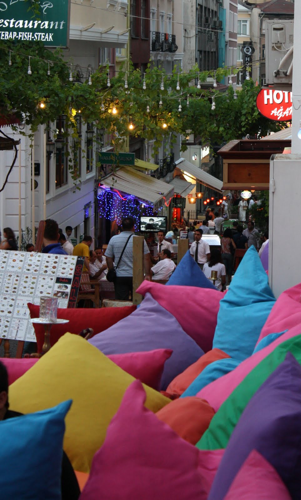 I ventured out to find a restaurant with something other than kabaps (it's spelled with a "p" here) on the menu, and walked in the opposite direction from the hotel because I just can't be "on" with Mesut at the souvenir shop and the wonderful staff at House of Medusa. I settled on one on a bustling little off-the-beaten-path street, closed to cars, and everyone is having a fun evening. I had tomato soup, which tasted like Campbell's, and Fettuccine Alfredo. The pasta was good, I guess, but I just couldn't eat it and pushed it away after four bites. The restaurant owner was concerned that the food wasn't all right, and offered to bring me something else, but I reassured him it was fine. He brought me some watermelon "on the house." I wandered aimlessly and took a few photos of some of the cafe side streets. The one in these photos has cushions instead of chairs and shishas.